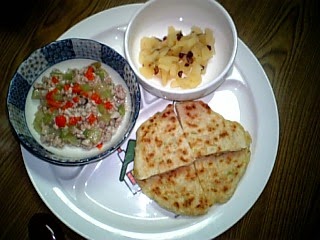 今日の離乳食は大豆とコーンのおやきと野菜スープとチーズケーキでした。